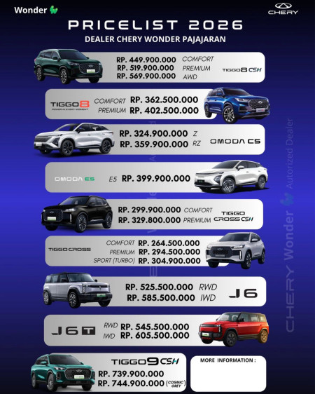 Selamat datang di Dealer Chery Wonder Pajajaran, pilihan terbaik untuk mendapatkan mobil Chery impian Anda dengan harga kompetitif, promo menarik, dan layanan profesional. Sebagai dealer resmi Chery di Jabodetabek, kami menawarkan berbagai model unggulan dengan teknologi canggih, desain modern, dan performa terbaik.
